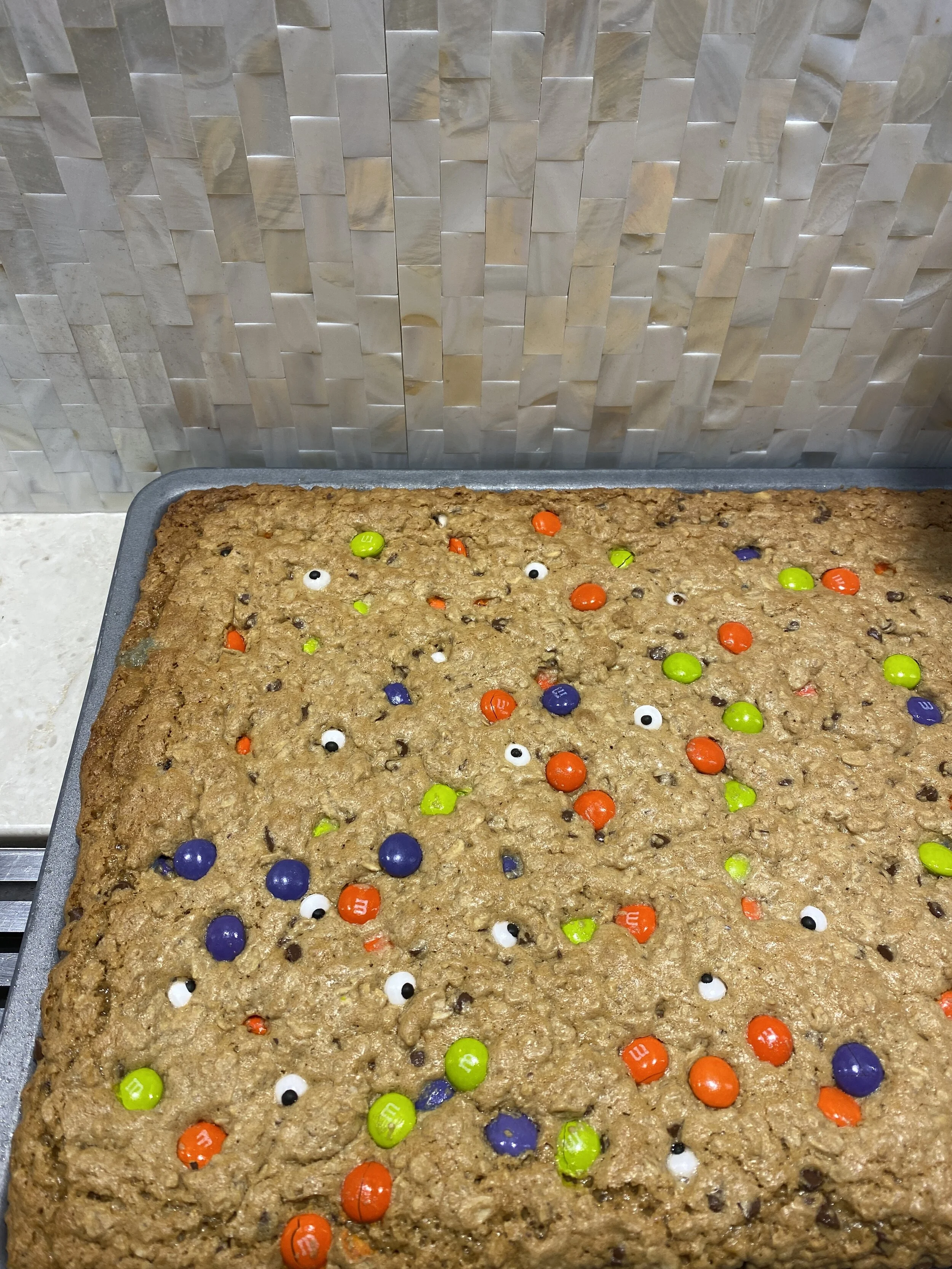 Add dry ingredients, starting with soda and salt. Mix in oats, one cup at a time.